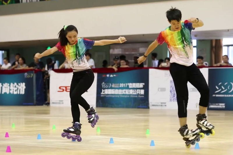There are different categories of freestyle slalom skating, but all of them involve moving your legs through a line of equally spaced cones, usually 80cm apart.Pair Slalom where you and your partner do two-minute routines of tricks, dancing through the cones to music, and judges choose a winner based on the variety and execution of your tricks.
