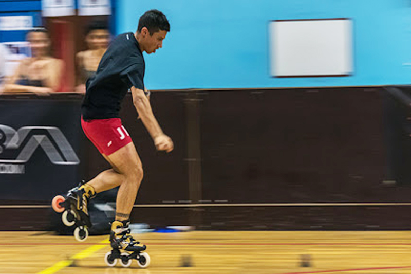 Freestyle slalom skating is a highly technical field of roller skating that involves performing tricks around a straight line of equally spaced cones.