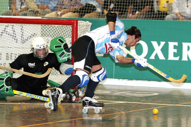 Roller hockey (quad) is played using traditional quad roller skates, affording greater maneuverability to the player - this results in games filled with fancy footwork, tight maneuvering, and is more similar to football or basketball. The stick is more or less the same as in bandy and shinty. The Quad hockey goalie uses a flat batting glove that provides rebound characteristics when blocking a shot on goal.